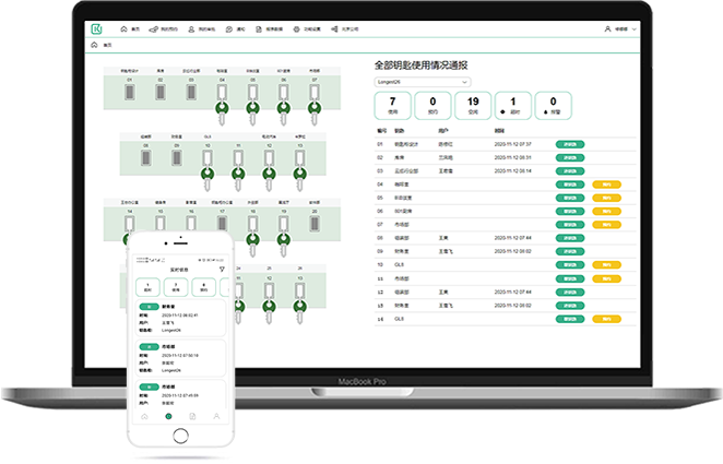 實(shí)時(shí)數(shù)據(jù):可以在手機(jī)/WEB隨時(shí)接收鑰匙柜異常、取還鑰匙等信息。
